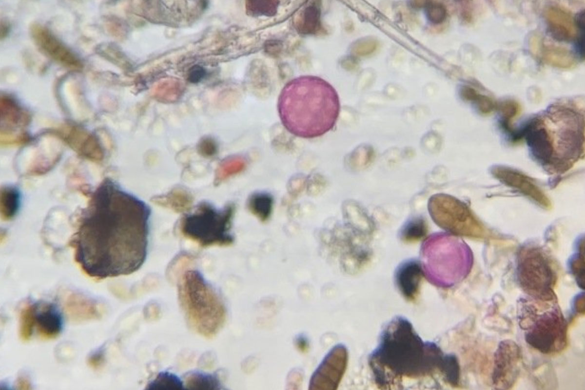 We are seeing several species of mold following recent warm rains, including alternaria (looks like a chicken leg in photo to the left), cladosporium and curvularia. There is also increasing Chenopod pollen, which includes Kochia and Russian Thistle (looks like a soccer ball in photo to the left) and our first sage pollen of the year showed up today. More weed pollen to come, unfortunately.